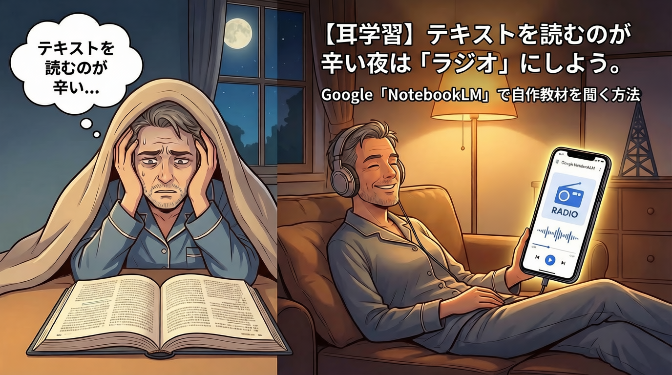 「老眼でテキストの文字が霞む…」「仕事で疲れて本を開く気力がない…」 そんな私たち50代の救世主となるのが、「耳学習」です。 Googleの無料ツール「NotebookLM」を使えば、あなたの持っているPDFやまとめノートを、「AI同士が会話するラジオ番組」に変身させることができます。その魔法のような手順を解説します。