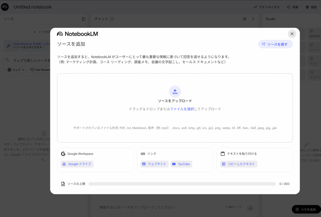 「ソースを追加」というところから、勉強したい資料をアップロードします。