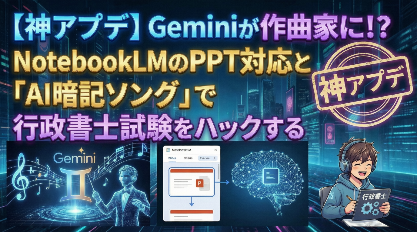 「スライド?音楽? 試験勉強に関係あるの?」と思った方。大アリです。 今回は、この最新機能をどうやって試験の「暗記」や「復習」に使い倒すか。そして、私が実際にGeminiに作らせた「ツッコミどころ満載のAI暗記ソング」を大公開します!