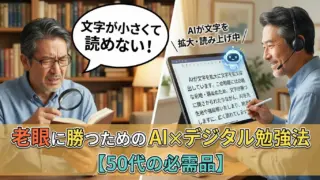 「テキストを読むと目が疲れる…」そんな50代受験生へ。Googleの無料AI「NotebookLM」を使えば、自作のまとめノートが“ラジオ番組”に早変わり!通勤中や家事の間に「耳学習」できる、画期的なAI活用法を図解で解説。
