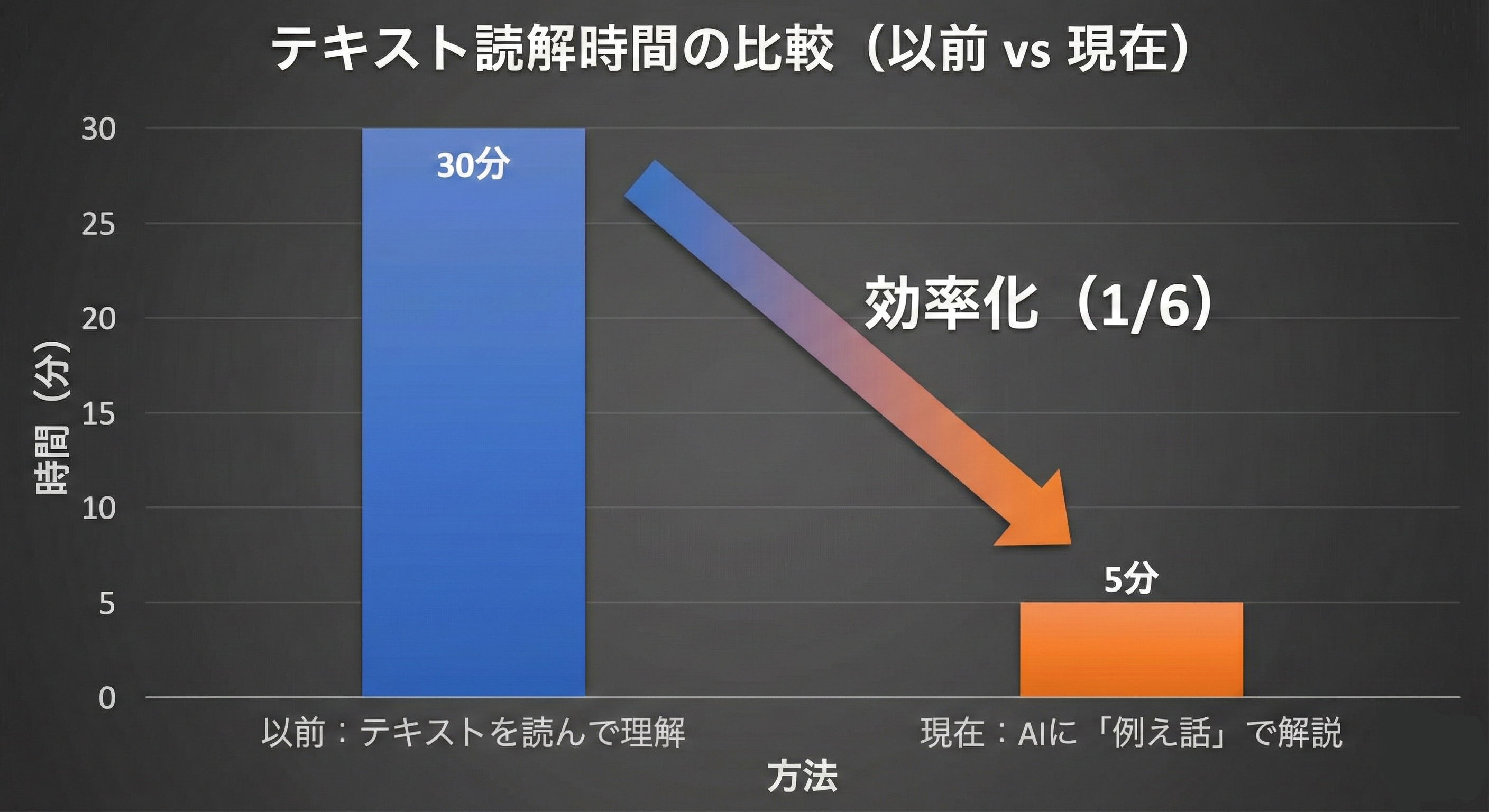 - 現在:AIに「例え話」で解説させて5分(1/6の効率化)